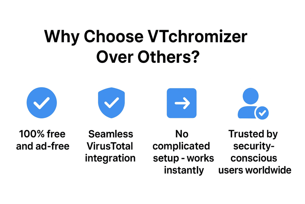 VTchromizer stands out from other tools because it is completely free to use and comes with no ads, ensuring a smooth browsing experience. Unlike complex security software, it requires no complicated setup and works instantly after installation.